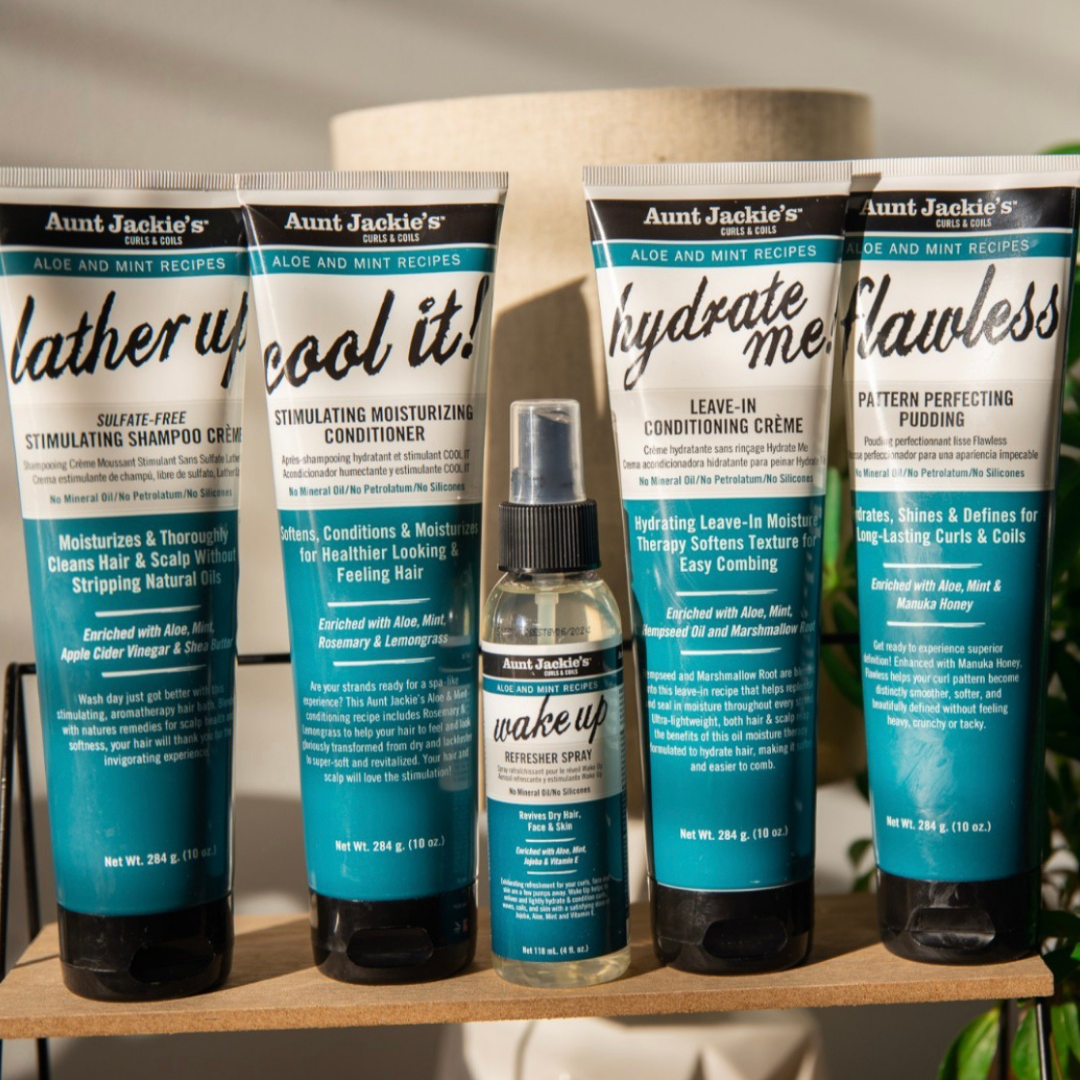Νέα ολοκληρωμένη σειρά Aloe & Mint της Aunt Jackie's αποτελείτε από 5 προϊόντα που θα αγαπήσετε. Σαμπουαν, conditioner, leave in conditioner, curly styler, και spray refresher. περιλαμβάνουν Μέλι Manuka, Αλόη, Μέντα, δεντρολίβανο και λεμονόχορτο βοηθούν στο σχηματισμό και στην υγεία της μπούκλας, κάνοντας την λεία και απαλη χωρίς να την βαραίνουν. Χωρίς παραμπεν, σιλικόνη και πετρέλαιο.